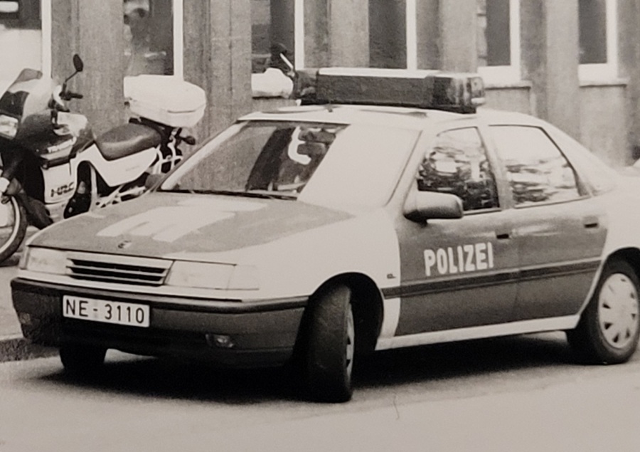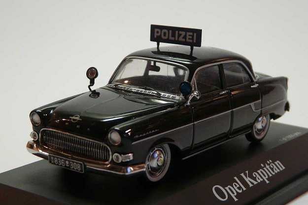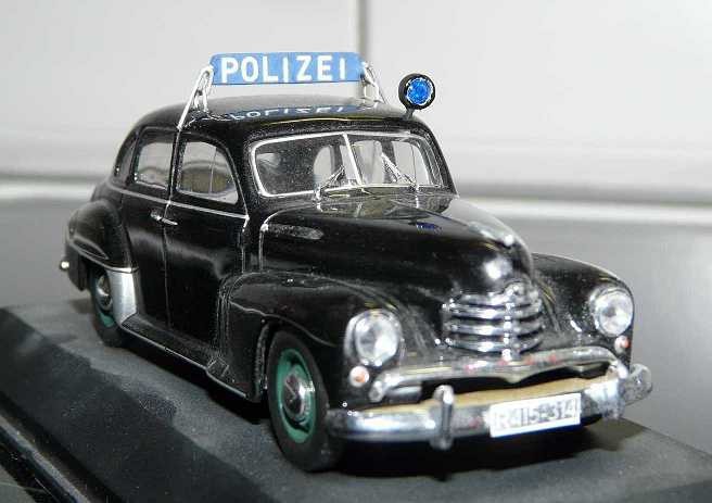 Opel Kapitän der Polizei Oberhausen, August 1956 -Das Fahrzeug hat Kennzeichen der britischen Besatzungszone, eine sogenannte "Dachbrücke" oder wie die Polizisten jener Zeit